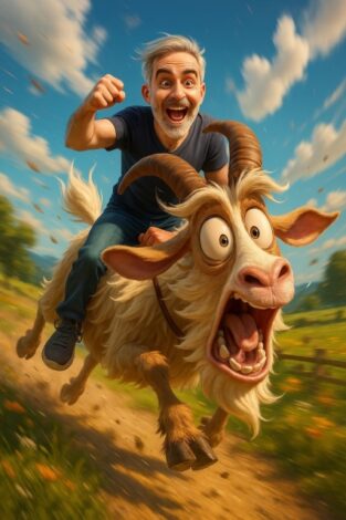 La imagen muestra a un hombre de cabello gris y barba, lleno de emoción, montando una cabra animada con ojos…