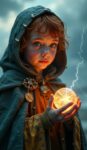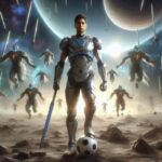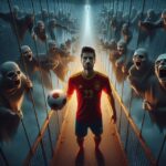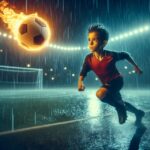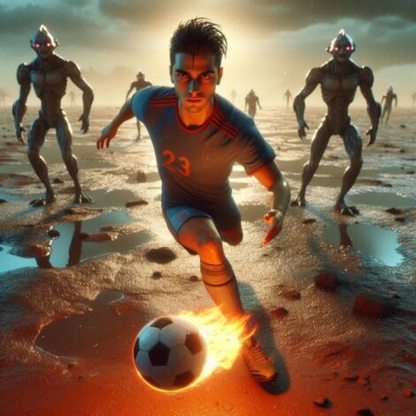 La imagen presenta un jugador de fútbol en un entorno fantástico, con una pelota de fútbol en llamas y rodeado…