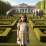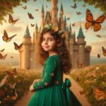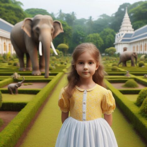 En esta imagen, una niña con vestido elegante se encuentra en un jardín exótico rodeada de árboles y esculturas asiáticas,…