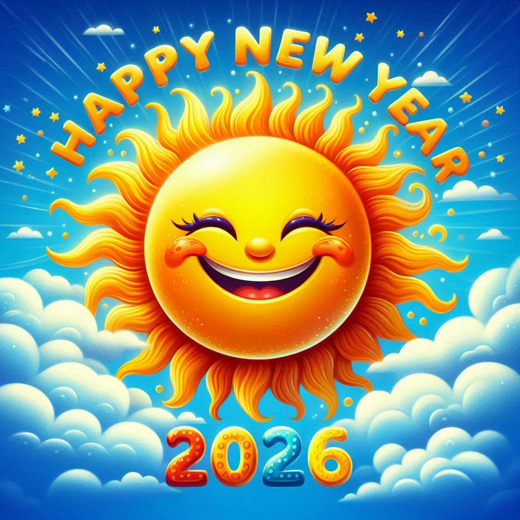 Descarga esta imagen hermosa de un sol sonriente brillando intensamente en el cielo, irradiando optimismo y alegría. El cálido resplandor del sol acompañado del texto “Feliz Año Nuevo 2026” hace que esta imagen sea perfecta para transmitir buenos deseos y energías positivas al comenzar el nuevo año. Ideal para fondos de pantalla, tarjetas festivas o para compartir en tus redes sociales. No te pierdas la oportunidad de descargar y compartir esta imagen llena de esperanza y felicidad.