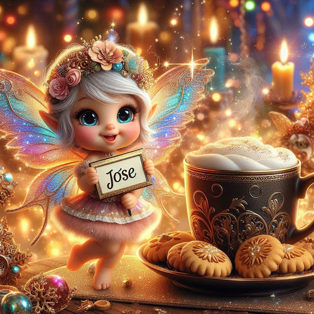 Descarga esta imagen hermosa de una adorable hada con aspecto encantador que sostiene un letrero con el nombre “Jose”. El ambiente festivo de Año Nuevo resplandece con luces cálidas, mientras una gran taza de café humeante y deliciosas galletas aportan un toque acogedor y alegre. Esta composición mágica transmite calidez y alegría, ideal para sorprender a alguien especial o personalizar tus saludos de Año Nuevo. ¡Descárgala y compártela ahora! #imagenesgratis #descargar #fotos #wallpaper