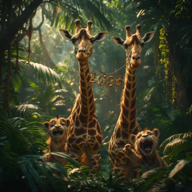 Descarga esta imagen hermosa de dos jirafas altas en un entorno selvático exuberante sosteniendo una cuerda con el número 2026…