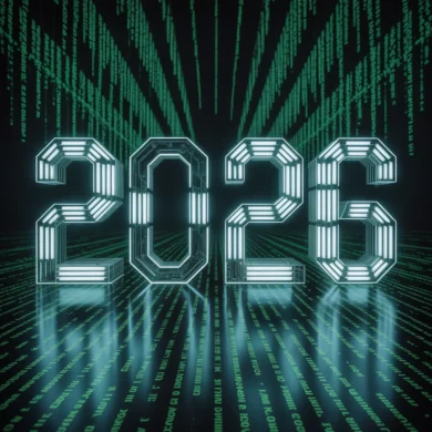 Descarga esta imagen hermosa de un arte futurista donde “2026” se forma completamente con letras y números brillantes en un…