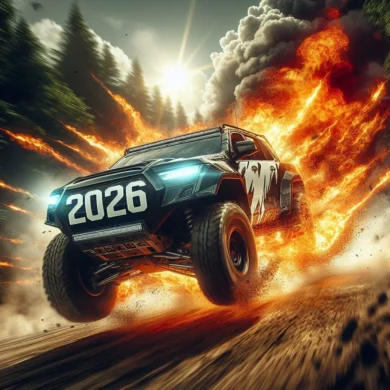 Descarga esta imagen hermosa de un potente SUV todoterreno lleno de acción avanzando con el año “2026” y llamas saliendo…