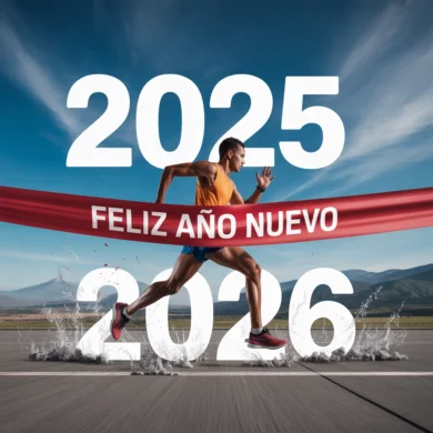 Descarga esta imagen hermosa de un corredor rompiendo una cinta marcada “2025” y entrando en “2026”. Esta escena dinámica simboliza…