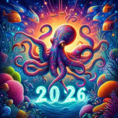 Descarga esta imagen hermosa de una creativa ilustración submarina de un poderoso pulpo sosteniendo los números brillantes “2026” en las…